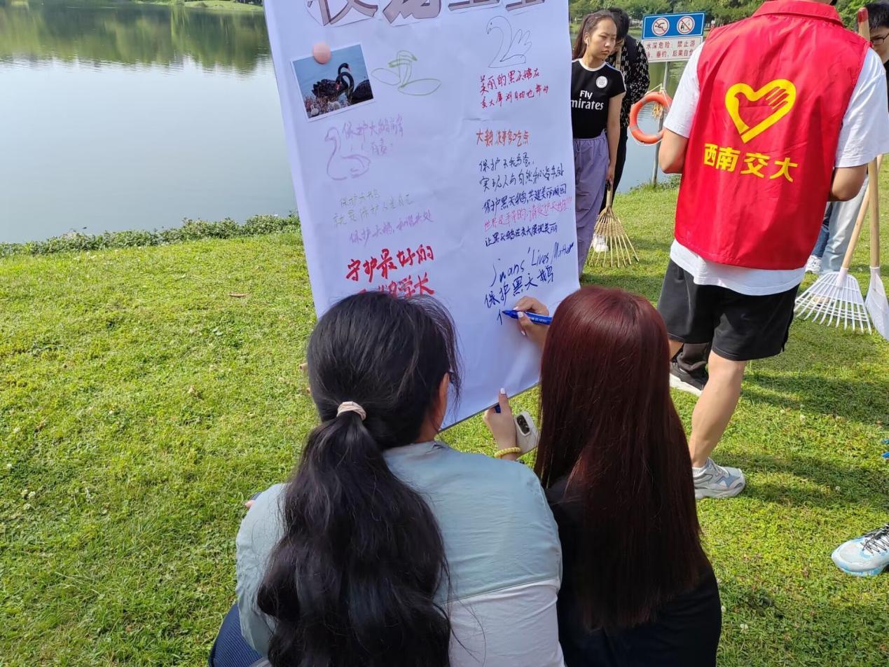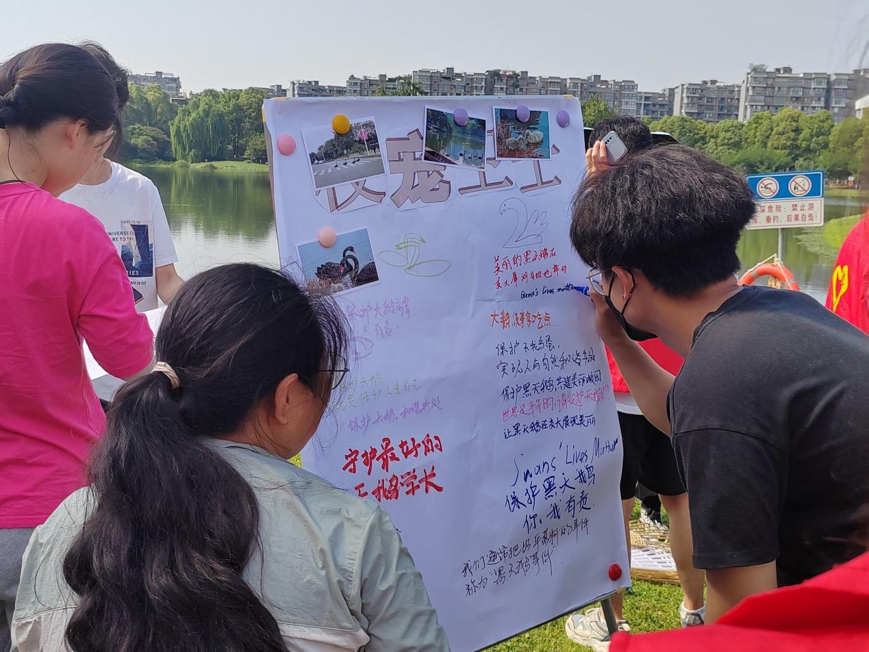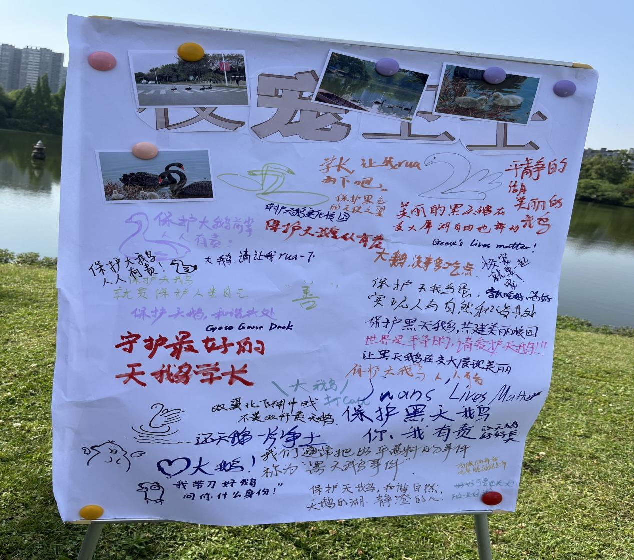 志愿者们完成清扫工作后,来到湖边放置展板处,用五彩的笔写下内心对校宠的喜爱与祝愿。活动吸引了大量路人游客加入,大家热情参与、积极创作,或绘制出自己脑海中的校宠形象,或写下“请勿随意投喂”等保护校宠的标语,一笔一划皆流露出“校宠卫士,我们在行动”的志愿热情。