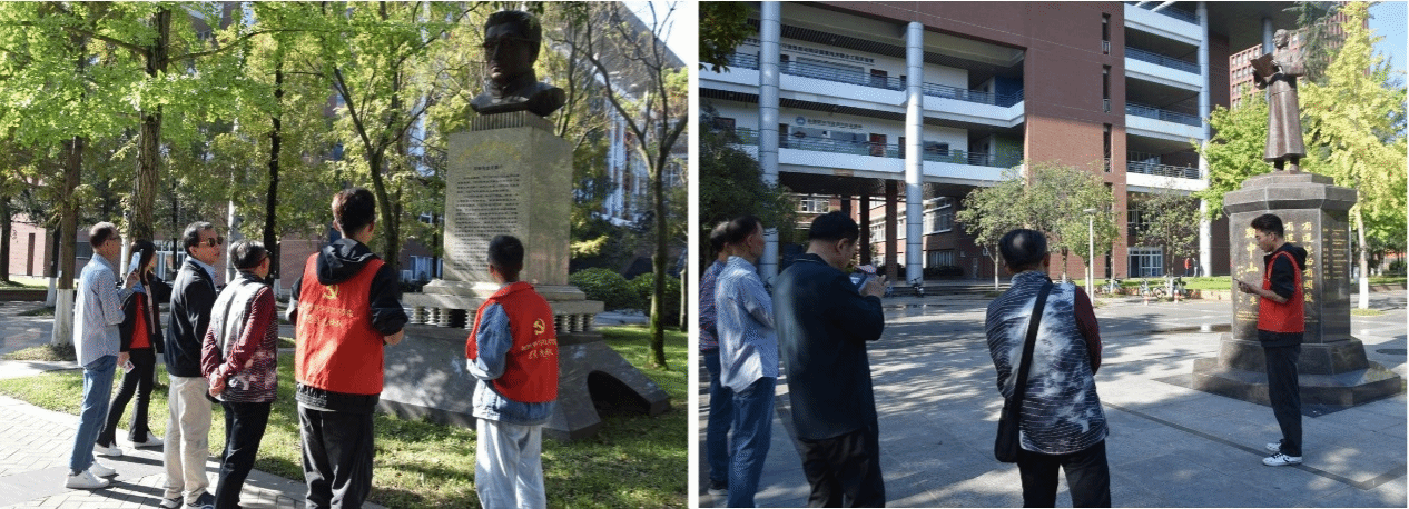 活动伊始,物理青协的志愿者们在南门迎接员工们,引导员工们在校园文化长廊参观,讲述每个雕塑背后的含义,铭记历史,不忘初心,砥砺前行。