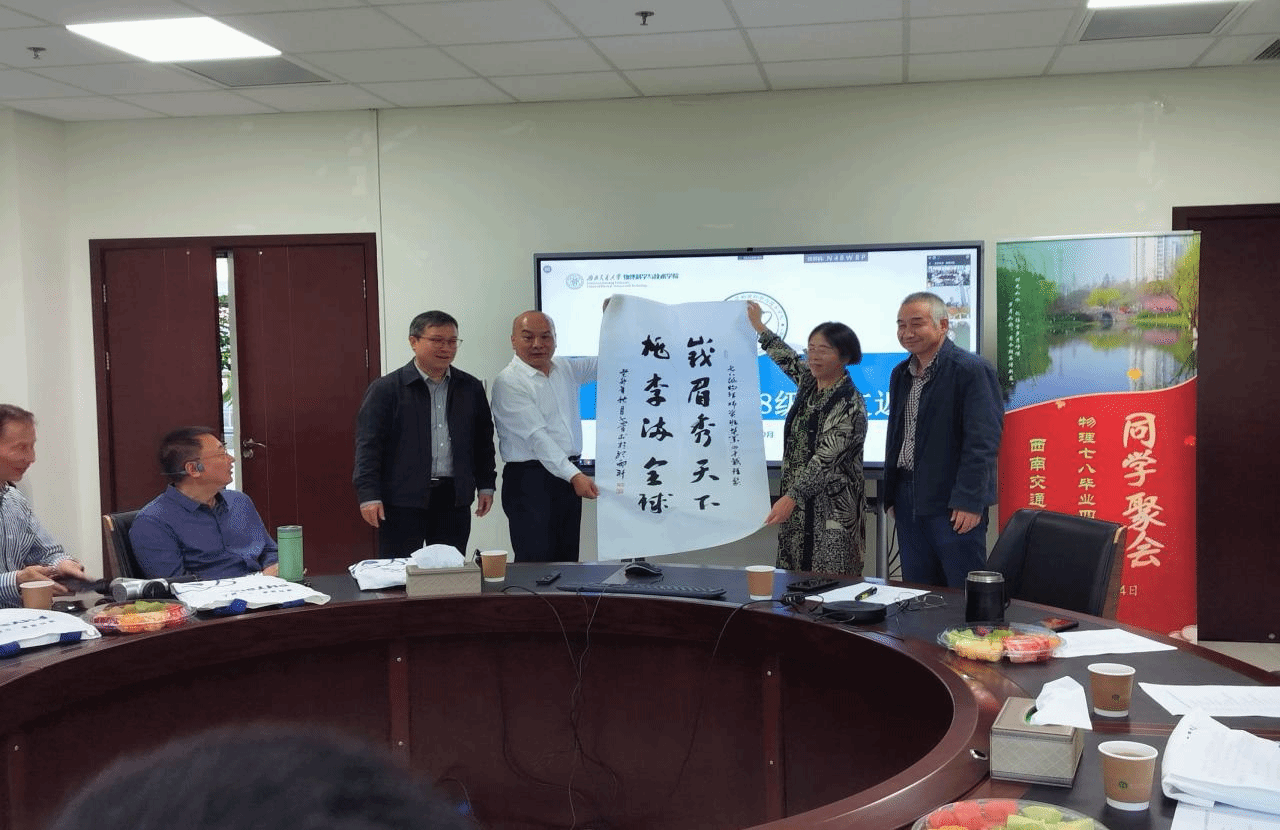 座谈会上,员工向学院赠送书法作品,所有员工相隔41年后再次合影留恋,留下“回家”的宝贵记忆。