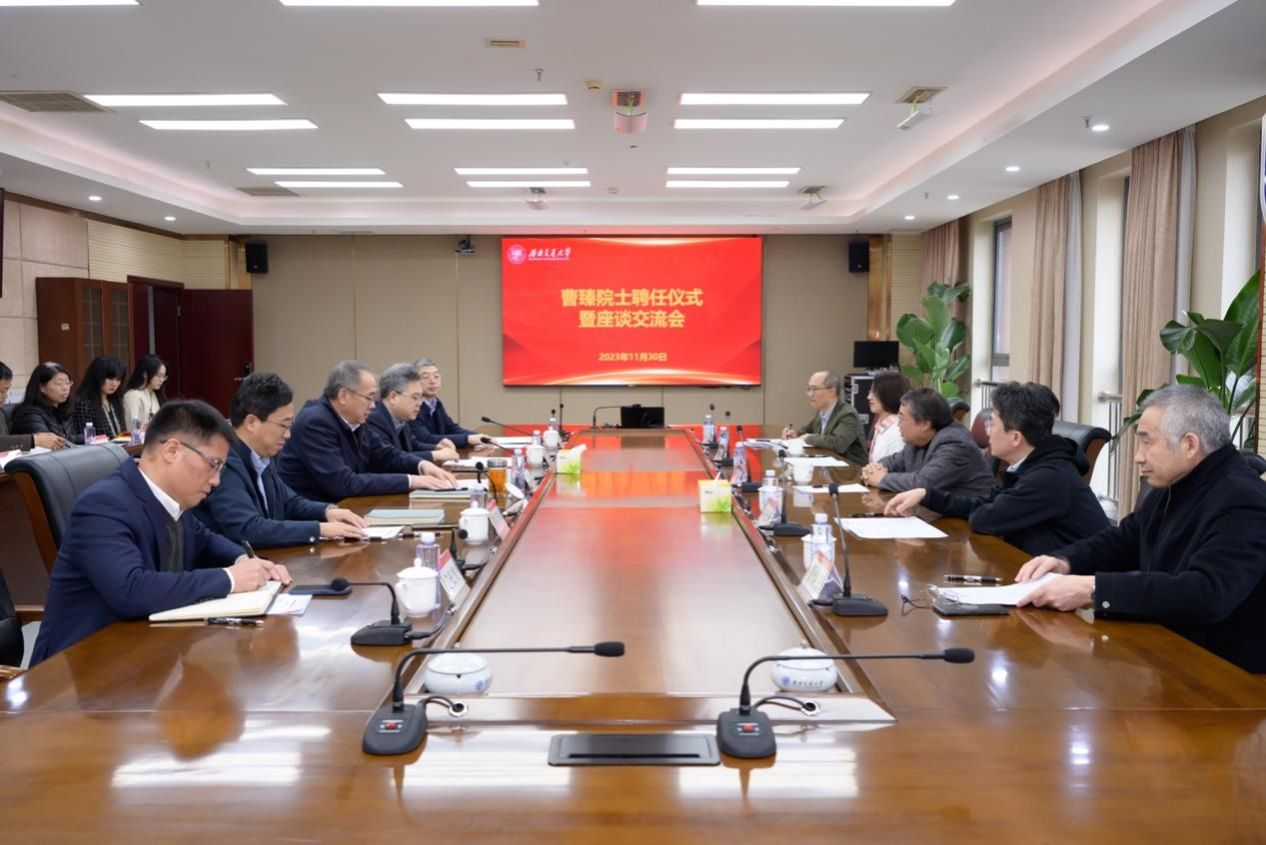 聘任仪式上,余敏明为曹臻颁发聘任证书并佩戴校徽。