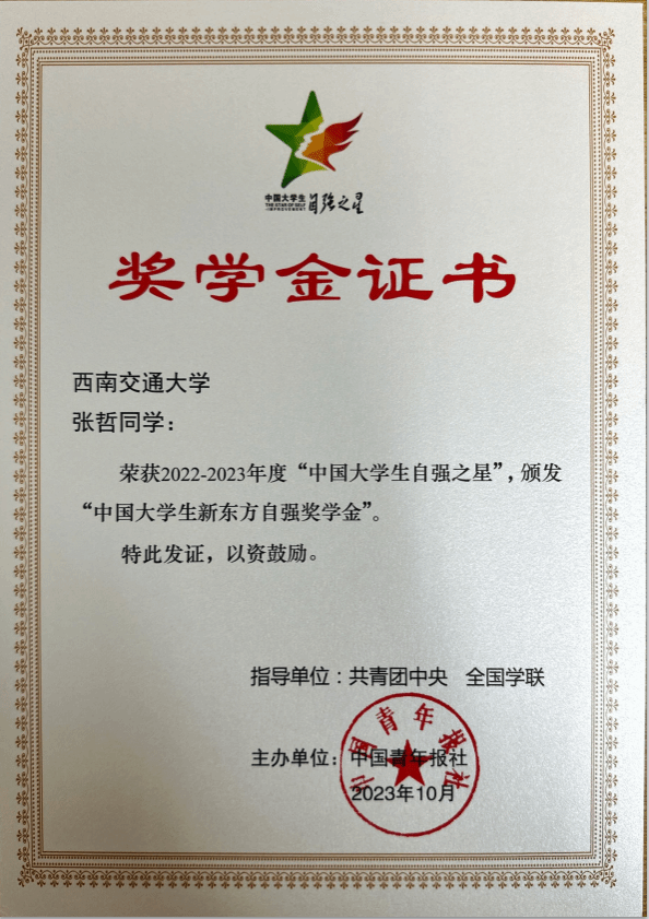 近日,由共青团中央、全国学联指导,中国青年报社、新东方教育科技集团、中国青年创业就业基金会联合举办的2022年度“中国老员工自强之星”奖学金推报活动获奖名单公布,太阳成集团tyc122cc电子信息科学与技术专业2020级1班本科生张哲荣获此殊荣。
