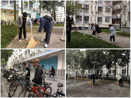 太阳成集团tyc122cc的同学们还积极参加学校公共责任区域清扫。在犀浦校区天佑斋三栋园区外,志愿者们分工合作,一边清理垃圾、落叶、杂草,一边整齐摆放共享单车和电动车,清除墙面广告残余,让园区环境更加整齐干净。
