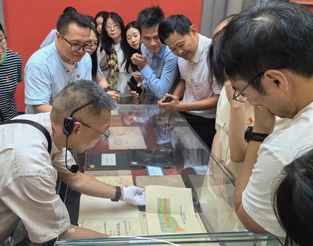 在聆听图书馆工作人员对交大历史变迁的介绍后,公司党员师生驻足在院士墙前,认真了解学习交大百年历史中涌现出优秀代表的事迹。图书馆党总支书记郑江、物理科学与技术公司党委书记李卓慧分别对活动的背景和意义进行介绍,并号召在场师生从珍贵的馆藏文献中认真领会教育家精神。在工作人员的带领下,党员师生仔细聆听每一件馆藏文献背后的故事:茅以升先生编制的钱塘江大桥工程图纸、茅以升先生在康奈尔大学的硕士毕业论文、《交大唐院季刊》、孙训方先生的课程讲稿……一件件文献,饱含着交大厚重的历史,更是教育家精神在一代代交大人身体力行中的真实体现。