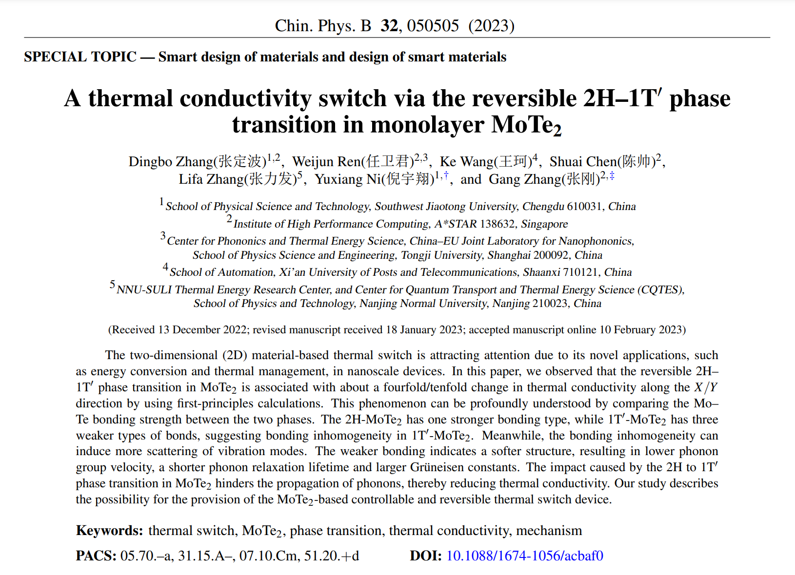 公司张定波博士后/助理研究员(第一作者)、倪宇翔教授(通讯作者)等人在《中国物理B(英文)》发表的研究论文“通过2H-1T'可逆相变实现单层MoTe2热导率可逆调控”成功入选2024年“长摘要双语传播工程”。据悉,《中国物理B(英文)》期刊年发文量超过1000篇,今年仅有10篇论文被推荐并入选该工程。