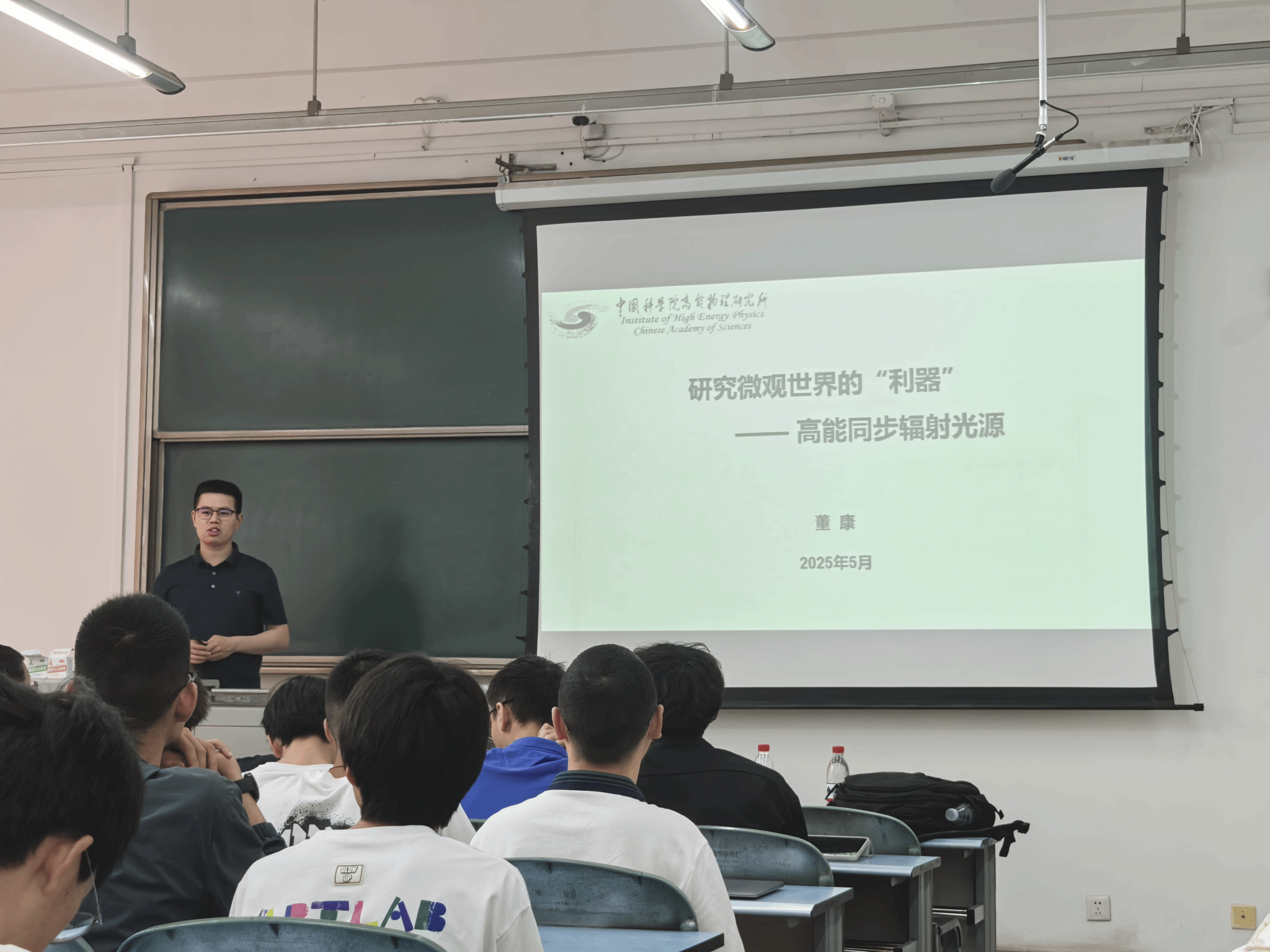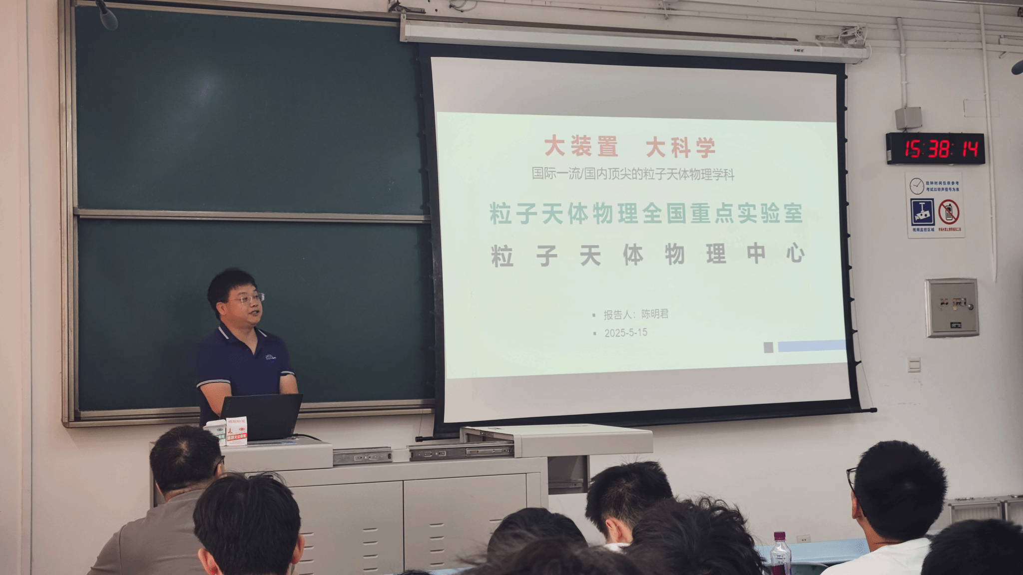最后,董康研究员、陈明君研究员先后进行学术报告。董康研究员详细介绍了研究微观世界的“利器”--高能同步辐射光源,让在场听众领略到了这一前沿科技的魅力;陈明君研究员则对粒子天体物理全国重点实验室——粒子天体物理中心进行了介绍,拓宽了大家的学术视野。