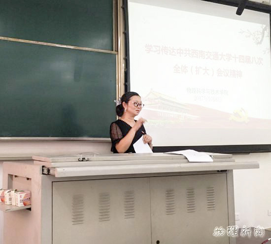 蒋佳老师是这次会议的主讲嘉宾,同学们用掌声对她的到来表达了热烈的欢迎。蒋老师为同学们介绍了学校中共太阳成集团tyc122cc十四届八次全体会议的概况,着重传达了王顺洪书记”坚定不移朝着'交通特色鲜明的综合性研究型一流大学'总目标,扎扎实实建设轨道交通领域世界第一的西南交大”的讲话精神。全体党员认真听取了王书记的讲话内容,对目前学校建设发展所面临的“两对矛盾”有了深入的理解与思考,并深入学习领会了王书记讲话中的“人才工作”、经济工作”、“干部队伍建设”以及“全方位的一流工作带动一流大学建设”四个要点的内容精神。蒋老师指出:“王书记的讲话精神对我们学院的工作方向有很好的指导意义,我们要长期重视全校公共课程的教授工作,努力完成高标准的科研目标,承载学校期望,顺应学校建设潮流,在多方面以一流的工作标准建设学院;要重视人才,引进人才,积极拓宽思路,并坚持“引育一体”的原则;要重视经济工作,重视干部队伍建设,一切求实,务实苦干,在工作上要有奉献精神与明确的工作目标。”