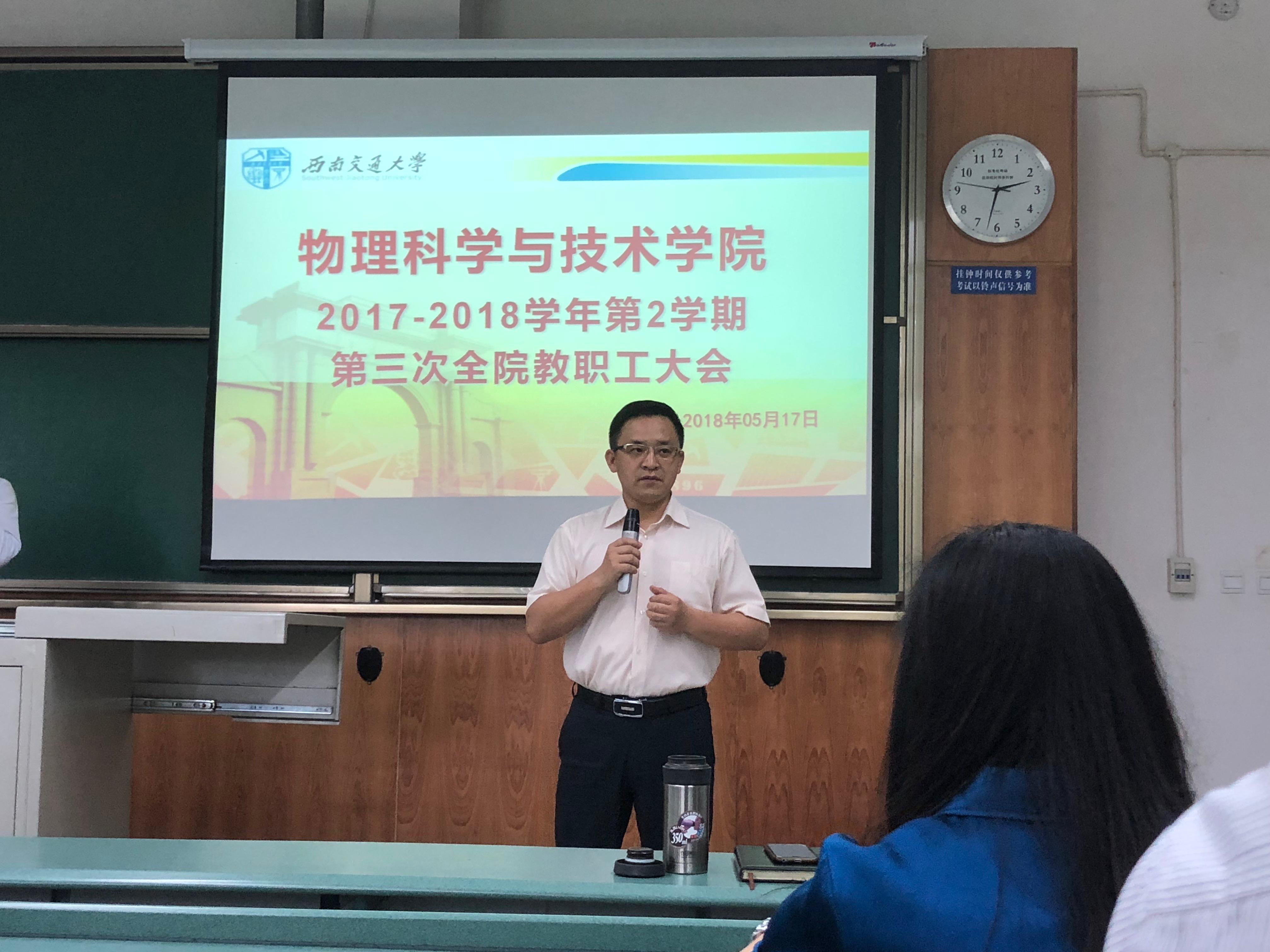 2018年5月17日下午,太阳成集团tyc122cc在犀浦校区X4151教室召开全院教职工大会。会议由公司党委副书记唐眉江主持。