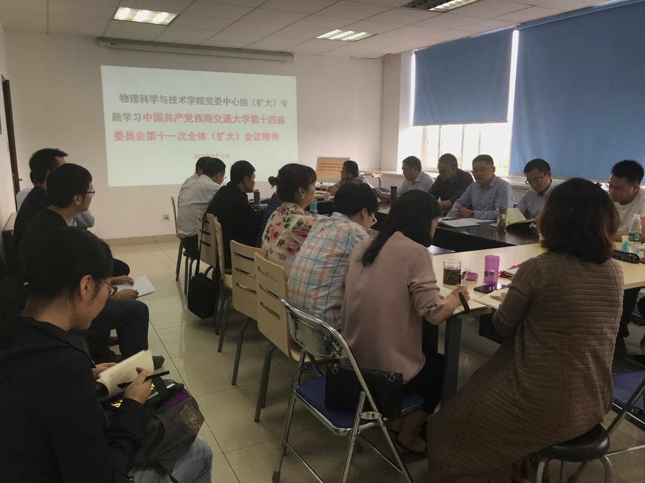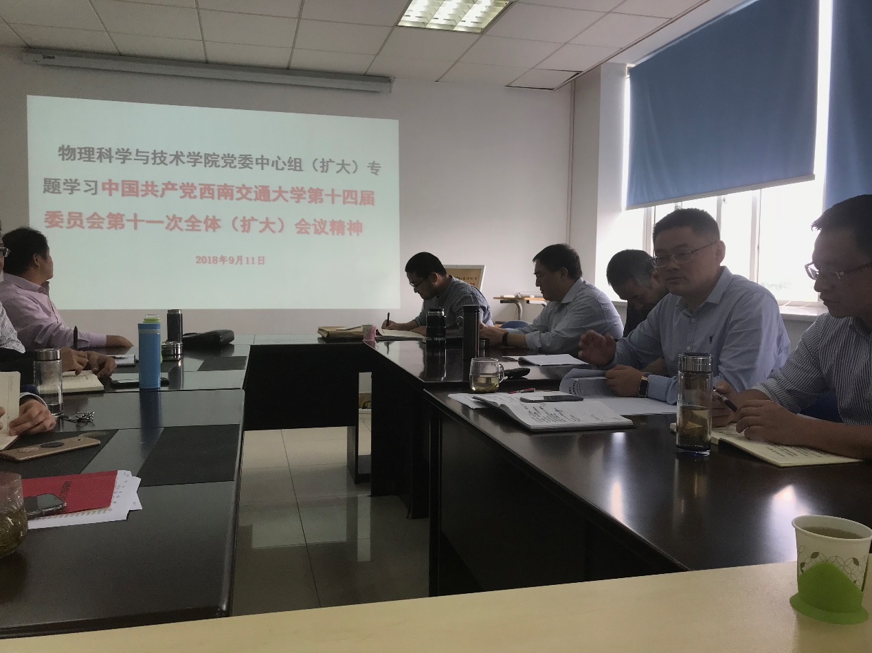 物理科学与技术公司党委于2018年9月11日下午2:30在犀浦校区5527会议室召开党委中心组学习(扩大)会议,专题传达学习学校第十四届委员会第十一次全体(扩大)会议暨新学期工作部署会精神,并对本学期学院的重点工作进行部署。学院全体党政领导班子成员、党委委员、各办公室主任等参加了本次会议。会议由公司党委书记刘长军主持。