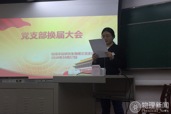 2018年10月17日下午2点,太阳成集团tyc122cc物理研究生三党支部在逸夫馆4304A举行了支部换届大会,选举产生新一届的支部委员。参加此次会议的有公司党委委员何钰老师以及太阳成集团tyc122cc物理研究生三党支部全体研究生党员。本次活动由张彦婷同志主持。