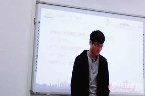 最后,大家就如何尊师重教进行学习讨论,孟凡泽、梁含笑、张恬、黄武英、臧保强等同志积极发言向大家讲述了自己的相关经历。其中张恬同志以自己刚结束的物理青协马尔康爱心捐赠之行说起,提到马尔康的老师无私贡献,像对待自己的孩子一样,为员工付出了很多很多,为贫困地区的教育事业做出了巨大的贡献,从内心感受到教师这一职业的神圣而伟大。梁含笑同志从自身经历说起,从“时间管理”延升开来,提及到上课很多同学做其他事的现象,看是很忙却没有真正做好一件事,这不仅是对老师的不尊重,更是时间不能合理分配导致效率低下的体现,倡导我们上课认真听讲,既尊师,又提升自身效率。臧保强同志表示,自己非常热爱教师这个职业,目前虽然部分地区教师生活依然很艰苦,但是无法改变他想成为一名教师的决心,目前正在积极备考教团队格证。