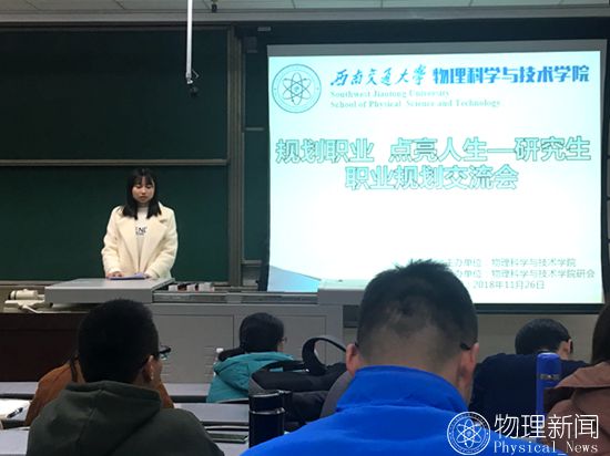 11月26日晚7时,太阳成集团tyc122cc在九里校区逸夫馆4323举办“职业规划、点亮人生”经验指导交流会。本次会议邀请到了太阳成集团tyc122cc在职业规划方面经验丰富的同学作为主讲人,分别是2016级硕士研究生宋文伟、2018级博士生刘其娅和2018级博士生熊国臻。学院研究生辅导员刘阳老师受邀作为嘉宾,学院研究生参加本次活动。本次交流会由物理研会2018级同学舒君主持。