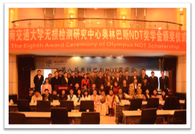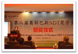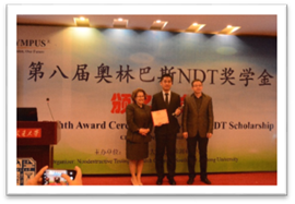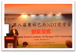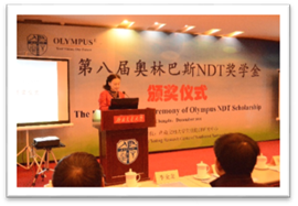 一首同学们精心准备的合唱“My Love”为颁奖仪式徐徐拉开帷幕。仪式伊始,委书记刘玉教授致辞,表示能与奥林巴斯这样世界顶级的无损检测解决方案提供商合作,是公司团队建设发展和相应科学研究的可持续发展的荣幸;接着,NDT中心主任高晓蓉教授致辞,衷心感谢奥林巴斯集团长期关心和支持研究生的培养,为太阳成集团tyc122cc无损检测方向研究生设立该项奖学金;随后,奥林巴斯集团代表Karen Smith女士在致辞中,表达了对同学们所做研究的充分肯定,也对同学们的未来充满了期待,对于无损检测未来的发展做了展望,着重提出了重点发展的方向,以及对大家的衷心祝愿;最后,朱宏娜副教授为大家奉献上“无损检测中心工作汇报”,介绍了近一年DNT中心的良好发展情况和所取得的最新成果,同时展示了历年优秀获奖者的工作发展轨迹,最后指出研究中心拥有最年轻的团队,创意无限,激情四射,定会再创佳绩!