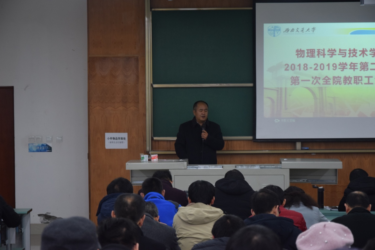 首先,刘庆想经理代表学院班子对2018年学院在学校各项工作的综合考核情况和学院绩效分配情况进行了通报。刘庆想经理指出,学院综合考核排名与以往相比有了较大的提升,感谢全院师生在过去一年所付出的努力,但与学院的期望仍有很大的差距和进步的空间,希望全院师生共同努力,主动作为,扬长补短,促进学院更好地发展。2018年学院绩效分配方案实施效果良好,充分说明以“成绩、成果、成效”为导向的绩效改革取得了很好的效果,也与学校绩效改革精神相吻合,下一步将继续完善方案,做到统筹兼顾又能激发学院全体教职工积极性和创造性,真正推进学院改革和各项事业更进一步。刘庆想经理着重对2019年学院三项重点工作作了要求。一是希望公司党政工团齐抓共管,坚持以德树人,着力构建学院人才培养“大思政”工作格局;二是落实全国本科教育大会精神,规范教学秩序,加强教学管理,提升教学质量,重点做好教师教学评价体系的建立和考核。三是要重视团队建设,重点做好物理一级学科评估工作,同时还要结合学科发展,认真做好新一轮人才培养方案的制定工作。
