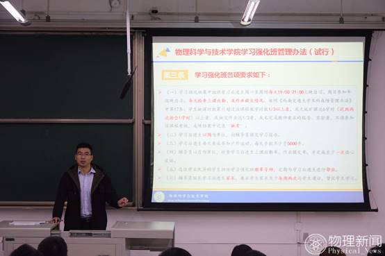 在唐眉江书记介绍完学习强化班开设的目的之后,门满洲老师介绍了学习强化班的基本情况,宣读了学习强化班管理规范,强调了对班内成员的基本要求,从各方面对学习强化班各位同学的学习生活进行监督,鼓励,争取能够达到学习强化班开设的目标,提升班内成员的自律能力,自我学习能力,最终掌握自我提升的各种方法。