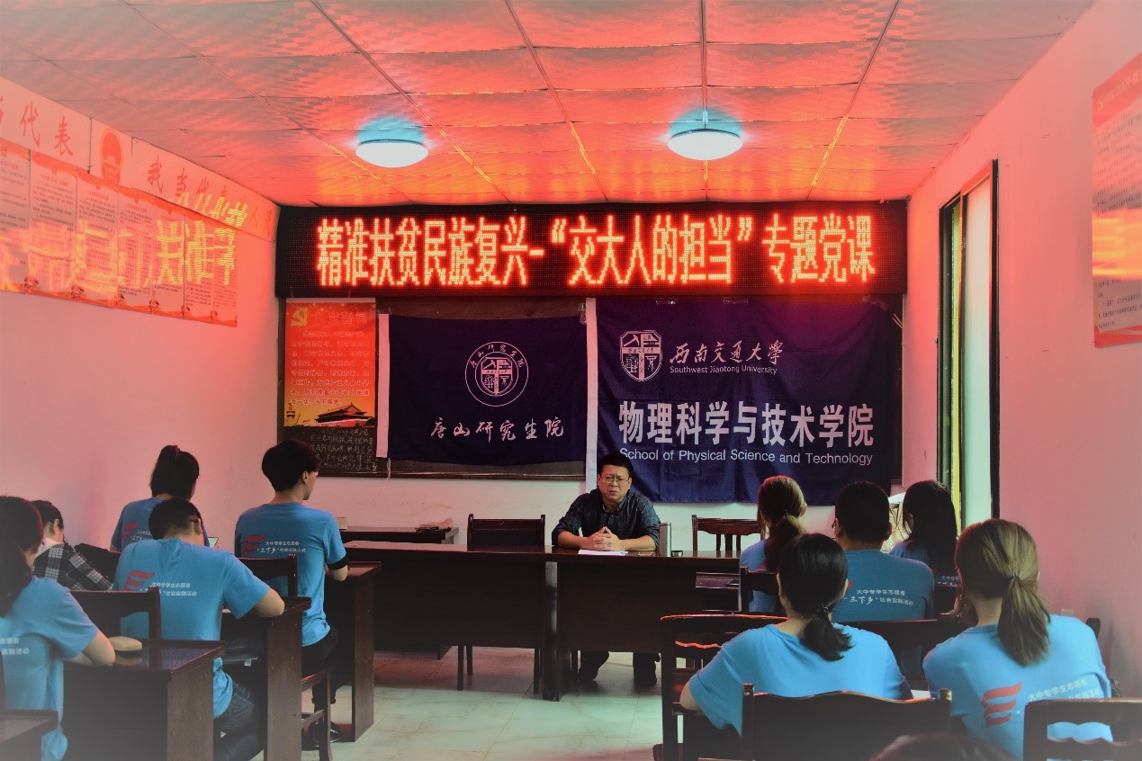 7月16日上午9:35分,太阳成集团tyc122cc“乡村振兴-投身实践”暑期三下乡社会实践队,在峨边彝族自治县五渡镇双凤村聆听了第一书记、交大峨眉校区扶贫干部王文彬书记的第一堂党课——“交大人的担当”。课上王书记首先对“精勤求学,敦笃励志,果毅力行,忠恕任事”十六字校训所蕴含的担当精神进行了解读,身为一名交大人,骨子里应有担当的精神。