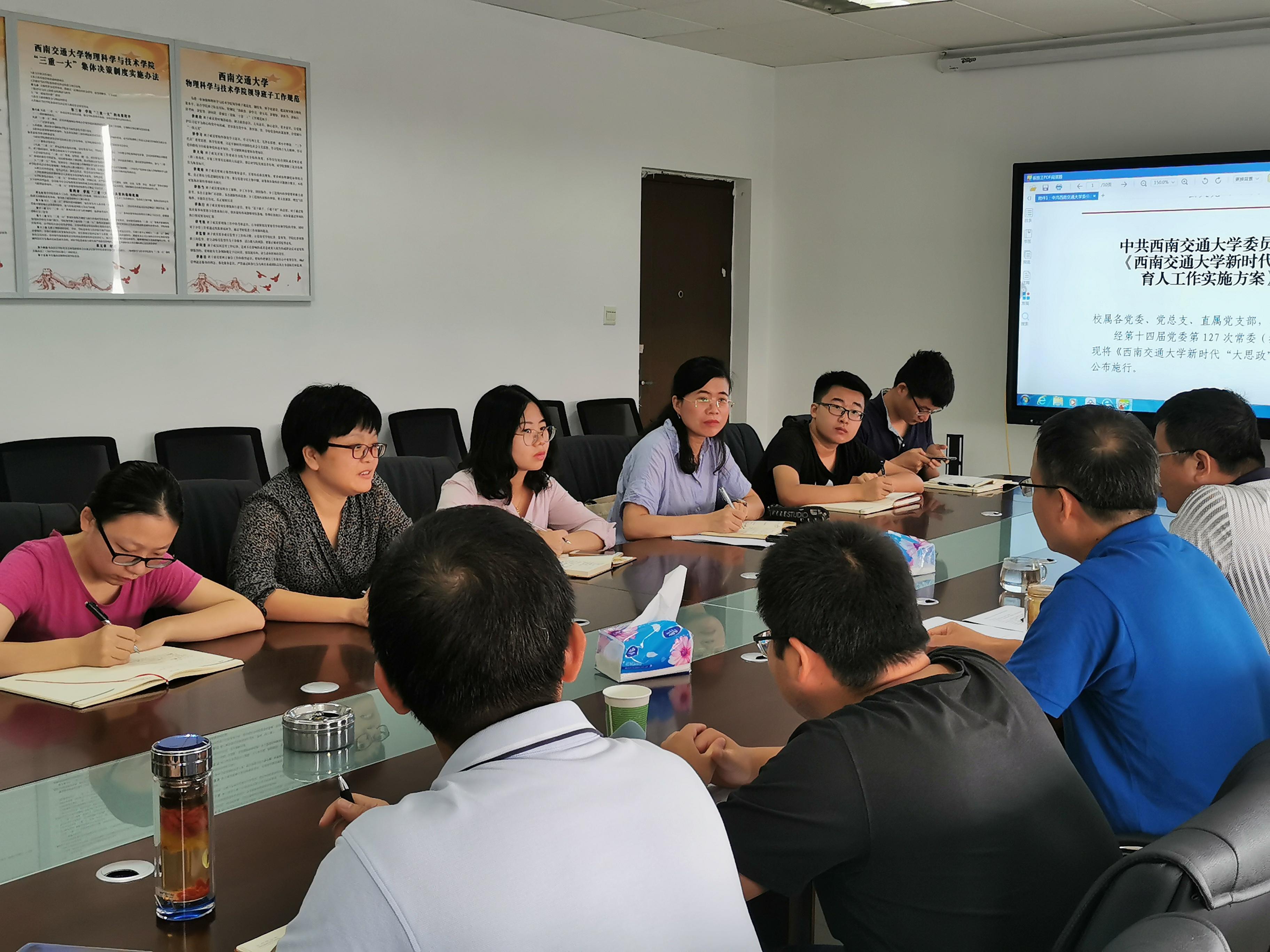 接着,刘玉书记对学校“大思政”育人体系建设方案进行了重点学习,要求学院加强双一流建设和思想政治教育工作。他强调,“立德树人”是教育的根本任务,立德就是立大德、功德和事德,树人即培养德智体美全面发展的社会主义建设者和接班人。交大人的初心是兴学育人,兴路报国,作为学院综合改革重大举措,学院一体化“大思政”育人体系的根本方法是以员工为中心,围绕员工,关照员工,服务员工;其次是做好思想政治工作,因事而化,因时而进,因势而新。