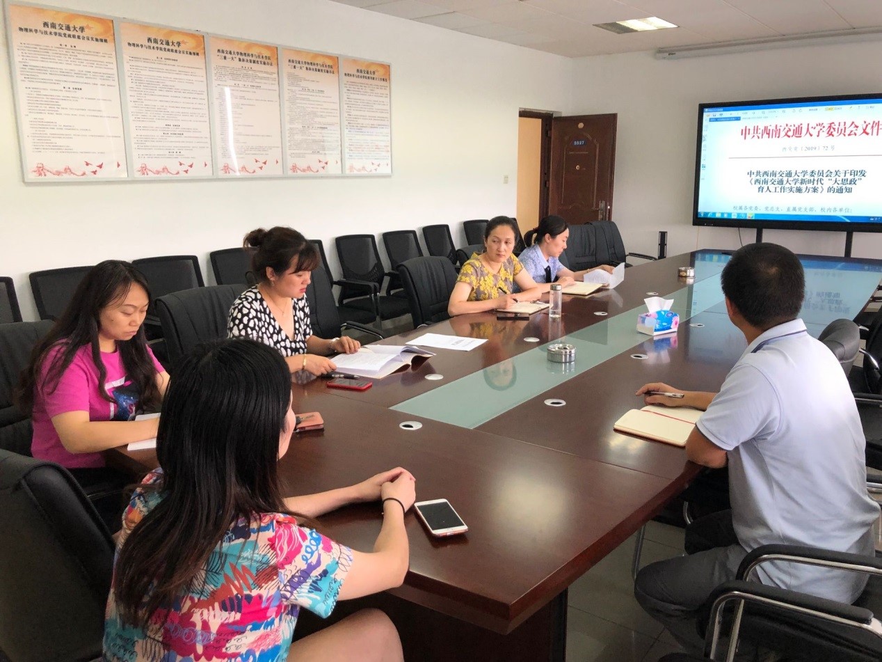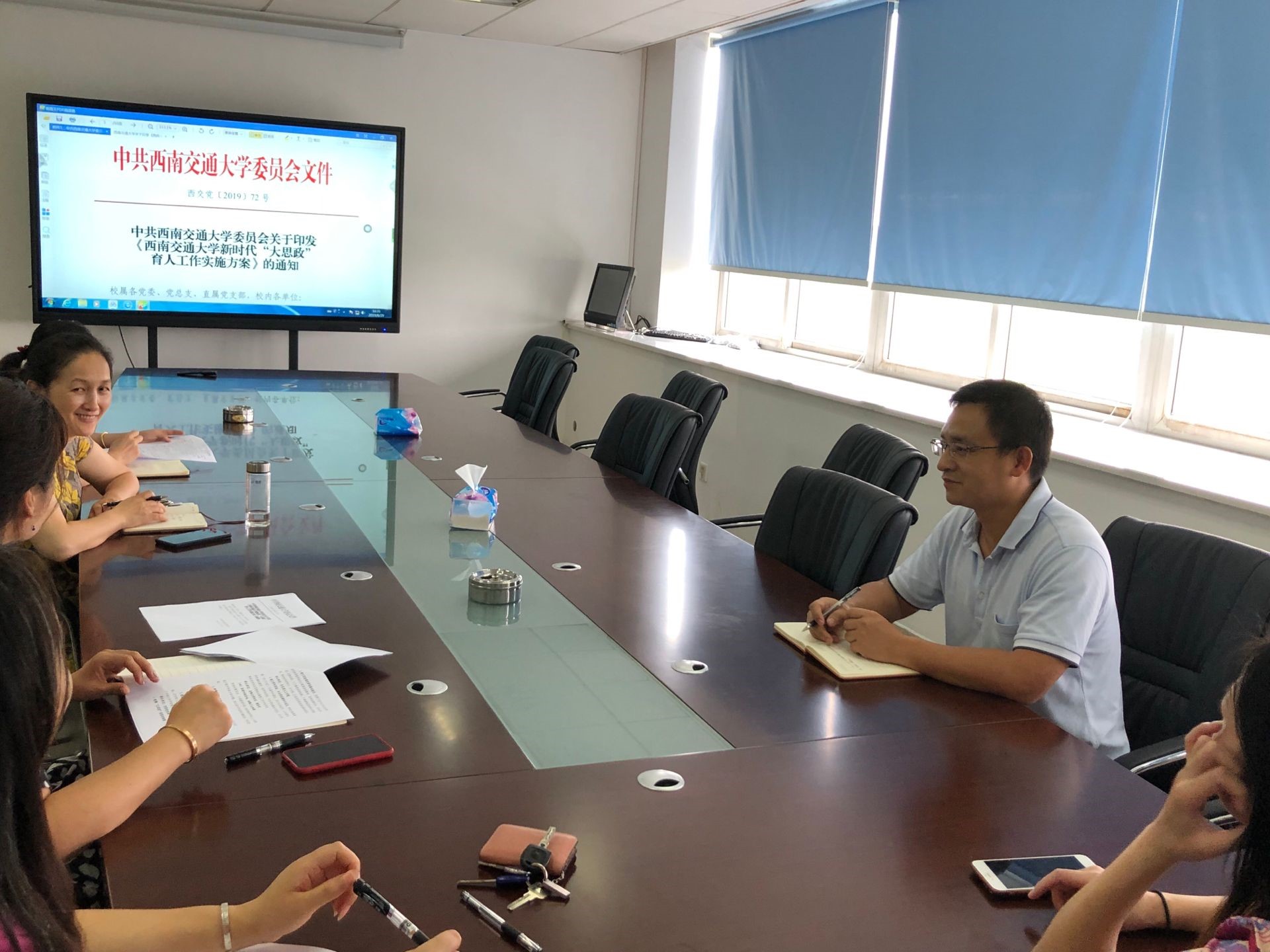 2019年8月29日下午,太阳成集团tyc122cc机关党支部召开组织生活会,学习传达《太阳成集团tyc122cc新时代“大思政”育人工作实施方案》和《公司关于新时代深化本科公司产品改革,提高人才培养质量的若干意见》的文件精神,以及国内外时事政治热点文章进行了研读讨论。会议由支部书记陈曦主持,机关党支部全体党员参加了会议。