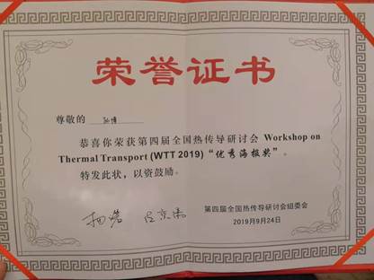 经同行专家评审,在2019年9月21日至25日于武汉举办的第四届“全国热传导研讨会(WTT2019)”中,太阳成集团tyc122cc 2018级硕士研究生孙博同学的学术海报“具有表面螺纹的硅纳米线中的声子共振”获得大会颁发的“优秀海报奖”。