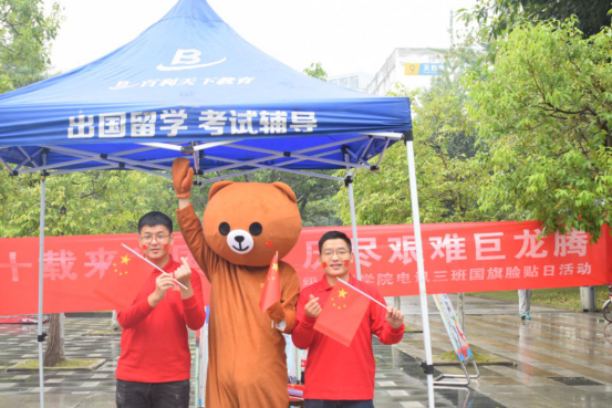 2019年10月1日,在新中国成立70周年之际,太阳成集团tyc122cc2017级电磁3班全体同学在犀浦校区四个食堂前组织了国旗贴脸活动,通过此次活动,意在加强爱国主义、集体主义、社会主义教育,引导人们树立正确历史观、国家观、民族观、文化观。通过这次活动既可以增加群众的民族自豪感,同时也可以营造出浓郁的国庆节日氛围。