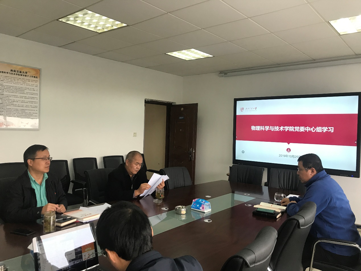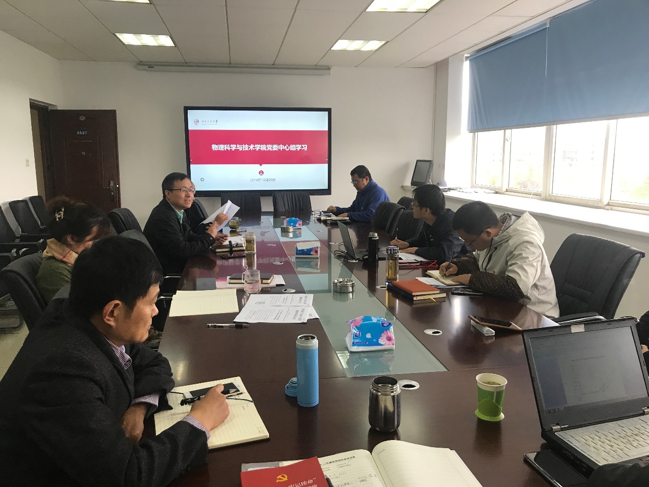 2019年10月25日下午2:30,太阳成集团tyc122cc第十次中心组学习会议在X5527召开。本次会议的主题为“深入学习《新中国发展面对面》和《中国共产党问责条例》”,学院全体党委委员参加会议。本次学习由党委书记刘玉同志主持。