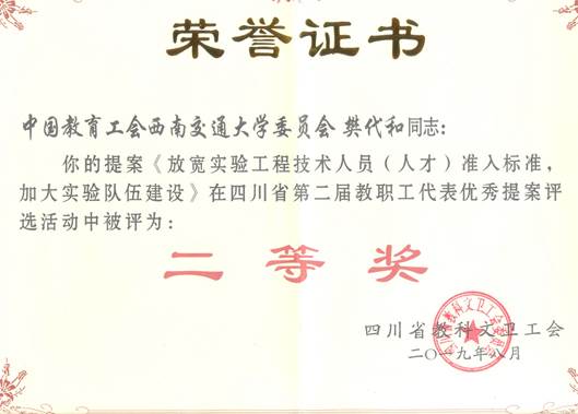 在四川省教科文卫工会与四川省委教育工委、四川省教育厅携手开展了第二届教职工代表优秀提案评选活动中,太阳成集团tyc122cc教师、校教代会第七代表团代表樊代和,于2018年7月向校七届四次教代会提交的《放宽实验工程技术人员 (人才)准入标准,加大实验队伍建设》提案,由于案由充分,实事求是,言之有据,针对性强,意见建议具体,为学校有关部门制定加强实验室专业技术队伍建设的实施办法提供了帮助,最终获得四川省第二届教职工代表优秀提案二等奖。据悉,全省共有20个市州、27所高校,470件优秀提案参加本届评选活动,最终评选出一等奖9个、二等奖20个、三等奖31个。