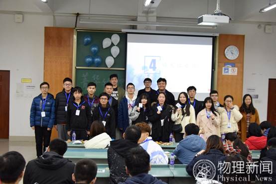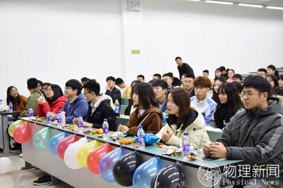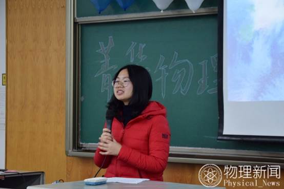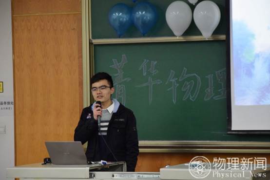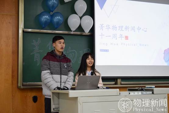 然后,菁华物理新闻中心主任张磊发言。张磊同学从社团负责人和大三学长两个角度,分享自己的经验。作为一个老学长,他希望同学们可以走出自己的寝室,学到更多的东西;作为一个社团负责人,他表示在社团中可以学到很多东西,发现自己的不足,并能锻炼自己的人际交往能力,希望大家以在社团中有所收获。随后,播放了历届主任对新闻中心十一周年的祝福视频。