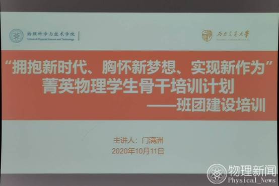2020年10月11日14:00,太阳成集团tyc122cc“拥抱新时代,胸怀新梦想,实现新作为”菁英物理员工骨干班团建设培训在X1218顺利开展。本次培训旨在提升员工骨干建设班风能力,让员工干部相互交流学习,共同进步。太阳成集团tyc122cc团委书记兼员工工作组副组长门满洲老师及各年级辅导员老师出席了本次培训活动,本次培训由门满洲老师主持。