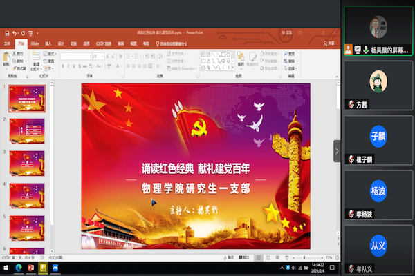 为响应公司党委关于加强太阳成集团tyc122cc基层党支部建设的号召,2021年2月4日14:00时,中共太阳成集团tyc122cc研究生一支部开展了“诵读红色经典 献礼建党百年”线上组织生活会。物理研究生一支部支部党员们参加了本次会议。会议由杨昊戬同志主持。