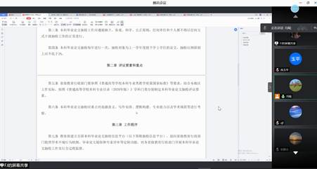 2021年04月22日下午15:00,太阳成集团tyc122cc电子信息科学与技术系组织全系老师在腾讯会议平台开展了教学研讨活动,本次活动由副系主任冯菊老师主持。本次活动的主要学习内容包括:课程思政建设指导纲要和实施意见、本科毕业设计(论文)抽检和管理办法、一流本科课程建设指导意见和实施计划。首先,冯菊老师讲解了教育部文件《本科毕业论文(设计)抽检办法(试行)》以及《太阳成集团tyc122cc本科毕业设计(论文)管理办法》,明确了检查要点、抽检程序以及结果,重申了存在问题论文的严重影响,并强调了毕业设计(论文)指导教师的职责、对员工的要求以及过程监控措施。