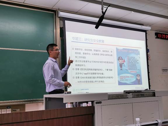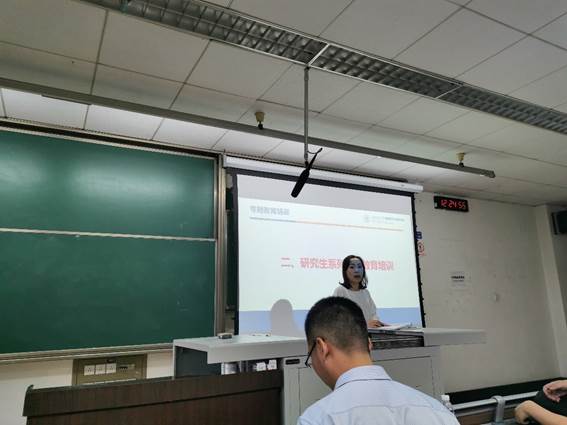 门满洲老师开展了安全教育、生涯规划、奖学金制度、事务中心管理四个专题的培训。在奖学金政策专题中,门老师详细地讲解了奖学金的分配比例和评选要求,谈到了双降级政策,鼓励大家不断奋勇向前,切不可骄傲懈怠。紧接着说到了研究生公司产品中心事务管理,再次带领大家熟悉和确认了各自的教研室名称和所属的党支部,以便后续学业档案等有关工作的顺利开展。又针对研究生的安全教育展开了一系列的讲解,从国家安全到学校安全再到实验室安全,方方面面俱到细致,加强了全体新生的安全认知意识。