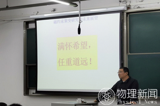 接着许宇鸿教授上台给同学们做了磁约束聚变能的研究及进展的学术报告。许宇鸿教授首先介绍了热核聚变能源对解决人类能源需求的重大意义。在努力实现碳中和的当今,核聚变已经成为热门研究。许宇鸿教授讲解了聚变能源的基本原理,并且从等离子体加热、诊断及磁场位形控制等方面向同学们介绍了当今国际上最先进的受控磁约束装置仿星器实验研究的进展。随后,介绍了国际热核实验反应堆(ITER)装置的概况、现状和面临的种种挑战。最后重点介绍了由其主导的中国第一台仿星器CFQC的概况和实验进展,并展示了该项目获得的种种荣誉,鼓励同学们投入国家核聚变的研究当中。许宇鸿教授给同学们赠言“满怀希望,任重道远”。