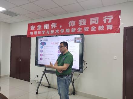 郭剑老师主要从网络安全、消防安全、人身财产安全、生理心理安全、和疫情防控安全这五个方面展开新生安全教育。他用详尽的数据和幽默的语言,分别详细介绍了这五个方面可能会遭遇的危险和潜在的安全风险,从具体方法上引导同学们提升相应的安全意识,提高同学们自我防范能力。