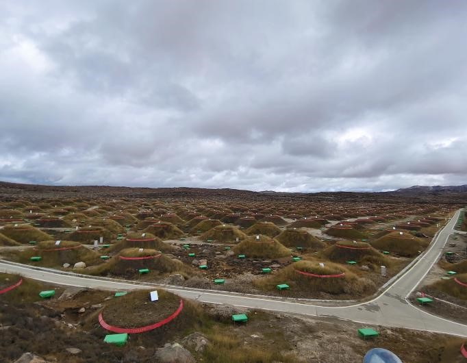 (LHAASO基地部分景观,围绕橙色带的“土堆”是谬子探测器单元,绿色防水布所包裹住的是电磁粒子探测器单元)