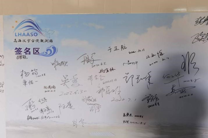 在对水切伦科夫探测阵列参观学习时,同学们也在高海拔宇宙线观测站的签名区留下了自己的名字。同学们郑重地将名字写到签名墙上,签字与周围老师的签字相比略显稚嫩,正如同学们本身在科学研究的进程中刚刚起步,青稚无比。但是肩上的使命和心中的理想,终会推动同学们不断向前努力,书写在物理研究中属于他们自己的华章。
