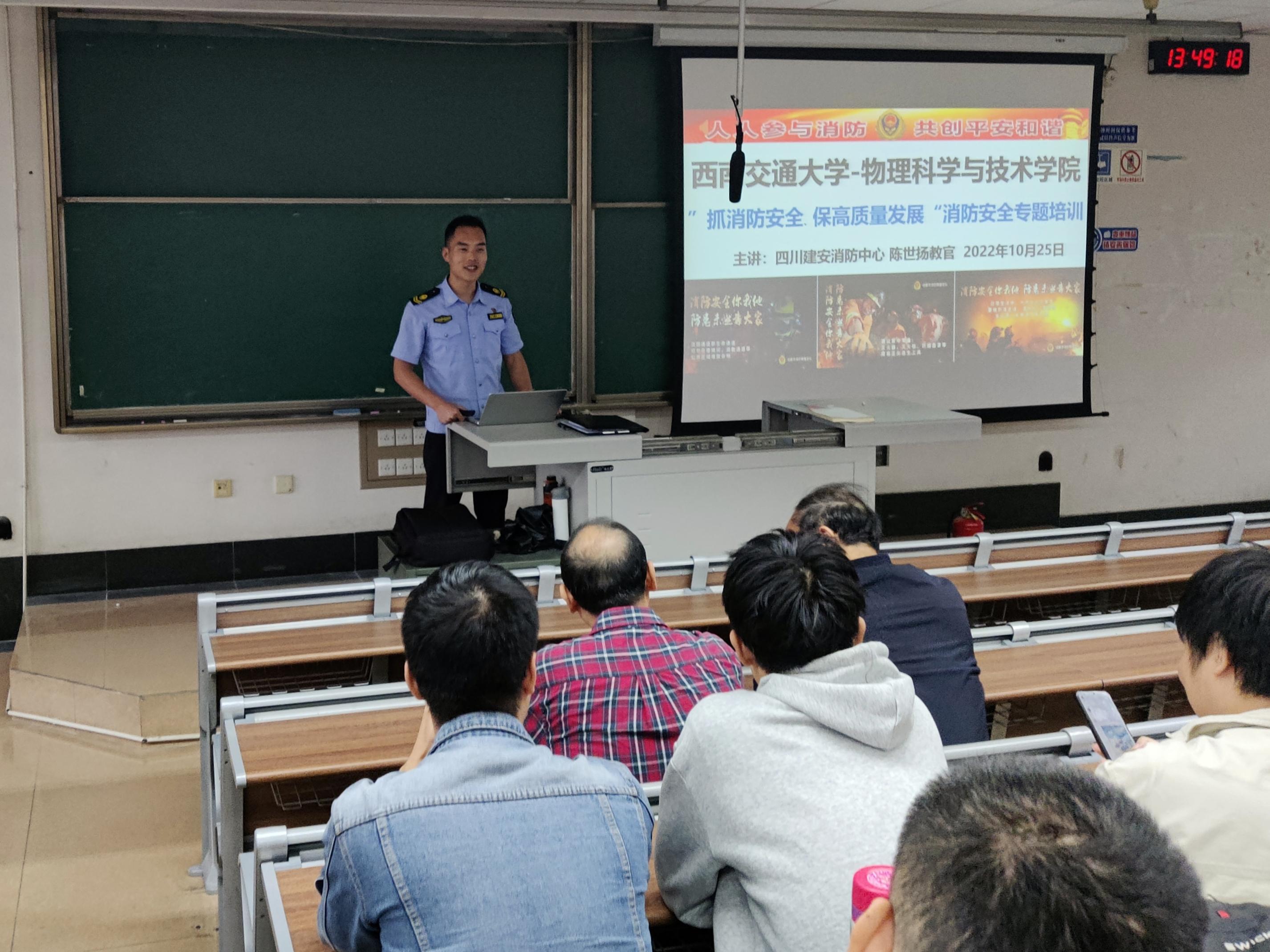 为响应119消防安全日主题“抓消防安全,保高质量发展”,进一步加强学院实验室安全管理,有效预防实验室安全事故发生,强化学院师生的安全责任意识,提高学院师生的自我保护能力,切实保障学院实验室工作正常有序开展,太阳成集团tyc122cc于2022年10月25日下午14:30在九里4409教室开展了消防安全专题培训会。本次培训由四川建安消防中心陈世扬教官主讲,学院研究生辅导员杨昊戬主持,学院高温高压物理研究所与聚变科学研究所的全体师生近100余人参与了本次培训。