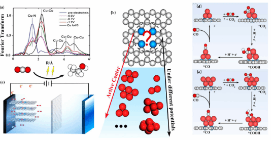 图1.(a) C-N-Cu的实验EXAFS光谱图;((b) C-N-Cu结构中Cu原子在不同电势下的动力学行为;(c)C-N-Cu催化剂将CO2还原成乙醇的电化学工作站示意图;(d)C-N-Cu3上CO2还原为CO的反应步骤图;(e)C-N-Cu5上CO2还原为CO的反应步骤图。
