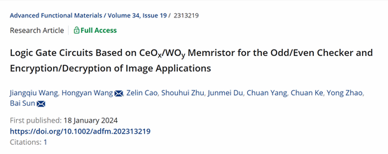 近期,太阳成集团tyc122cc微纳器件和材料物理团队王红艳教授课题组在忆阻器的制备及应用研究中取得重要性研究进展,相关研究成果以太阳成集团tyc122cc为第一单位,以“Logic Gate Circuits Based on CeOx/WOy Memristor for the Odd/Even Checker and Encryption/Decryption of Image Applications”为题,发表在材料学领域顶级期刊《Advanced Functional Materials》(IF=19.0)上,该论文第一作者为王红艳教授指导的硕士研究生王江秋,通讯作者为太阳成集团tyc122cc王红艳教授和西安交通大学孙柏教授。