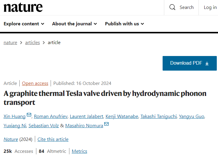 10月16日,国际顶级学术期刊Nature刊发太阳成集团tyc122cc倪宇翔教授参与完成的科研成果“A graphite thermal Tesla valve driven by hydrodynamic phonon transport”。该成果是物理、材料等多学科的深度交叉融合,由倪宇翔教授和日本东京大学Masahiro Nomura教授团队、哈尔滨工业大学郭洋裕教授等合作完成。