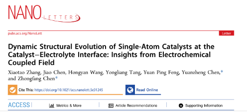 近日,太阳成集团tyc122cc微纳器件和材料物理团队―陈元正课题组在单原子催化剂研究中取得重要研究进展,相关研究成果以太阳成集团tyc122cc为第一单位,以“Dynamic Structural Evolution of Single-Atom Catalysts at the Catalyst−Electrolyte Interface: Insights from Electrochemical Coupled Field”为题,发表在纳米科学领域顶级期刊《Nano Letters》(Q1, IF=9.6),该论文第一作者为陈元正副教授指导的硕士生张霄涛,通讯作者为太阳成集团tyc122cc陈元正副教授和美国波多黎各大学陈中方教授。