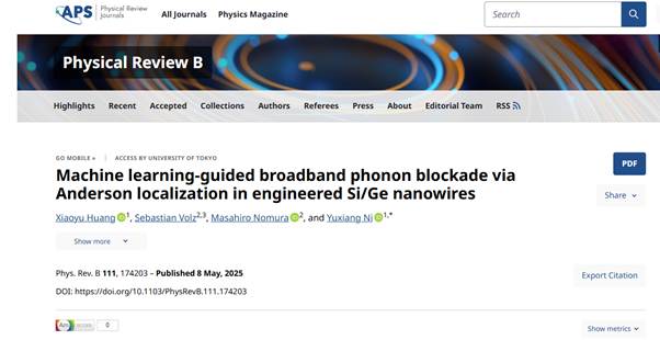 近日,太阳成集团tyc122cc微纳器件与材料物理团队在低维材料结构设计方面取得重要研究进展,相关研究成果以太阳成集团tyc122cc为第一单位,以“Machine learning-guided broadband phonon blockade via Anderson localization in engineered Si/Ge nanowires”为题,发表在物理学领域权威期刊《Physical Review B》上,该论文第一作者为2022级博士研究生黄晓宇,通讯作者为太阳成集团tyc122cc倪宇翔教授。