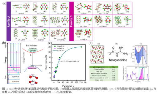 含能材料在受到外界能量的刺激后,会经历许多复杂的物理化学过程。到目前为止,含能材料广泛接受的点火机制是热点理论和声子泵浦机制。该科研团队基于以上模型,提出载流子的迁移在能量传导过程中起着重要的作用。该工作研究了16种含能材料(图1a)的力学模量和电子结构与感度的关系,通过对计算结果和实验已有数据的分析,提出一种新的理论解释。