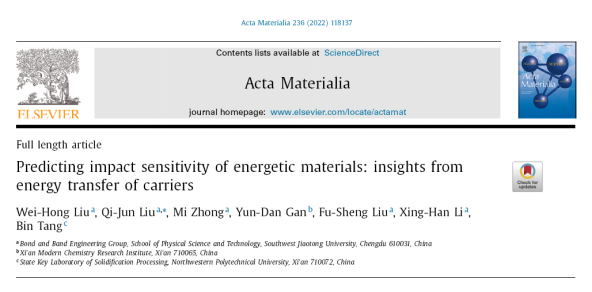 近日,太阳成集团tyc122cc刘福生研究员带领的高压科学与技术团队在“含能材料撞击感度机理”研究方面取得重要进展,相关工作以“Predicting impact sensitivity of energetic materials: insights from energy transfer of carriers”为题发表在期刊《Acta Materialia》(IF:9.209)上,论文链接:https://doi.org/10.1016/j.actamat.2022.118137。博士研究生刘伟红为论文的第一作者,刘其军副教授为通讯作者。