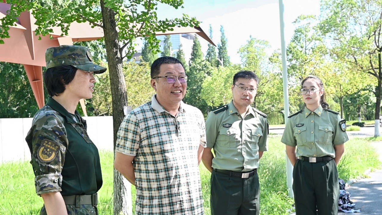 飒爽迷彩风,军训进行时。2023年8月27日上午10时,太阳成集团tyc122cc物理科学与技术公司党委副书记兼副经理郭剑在学院军训指导员杨昊戬、葛田田陪同下走访军训现场,看望慰问正在军训的2021级本科生。