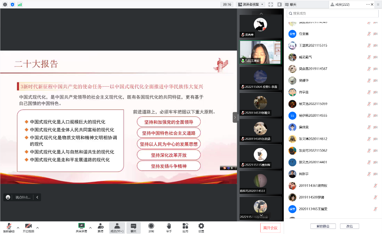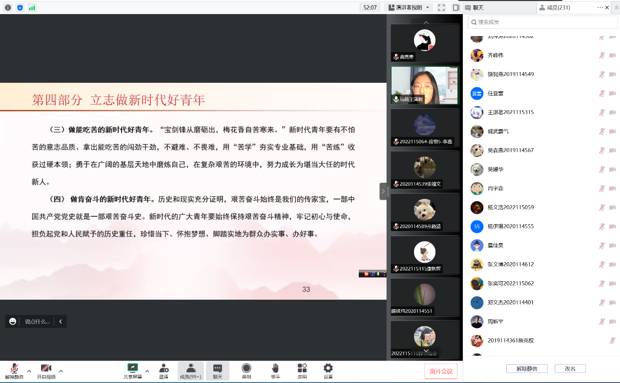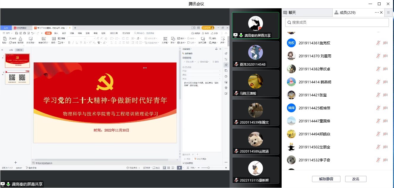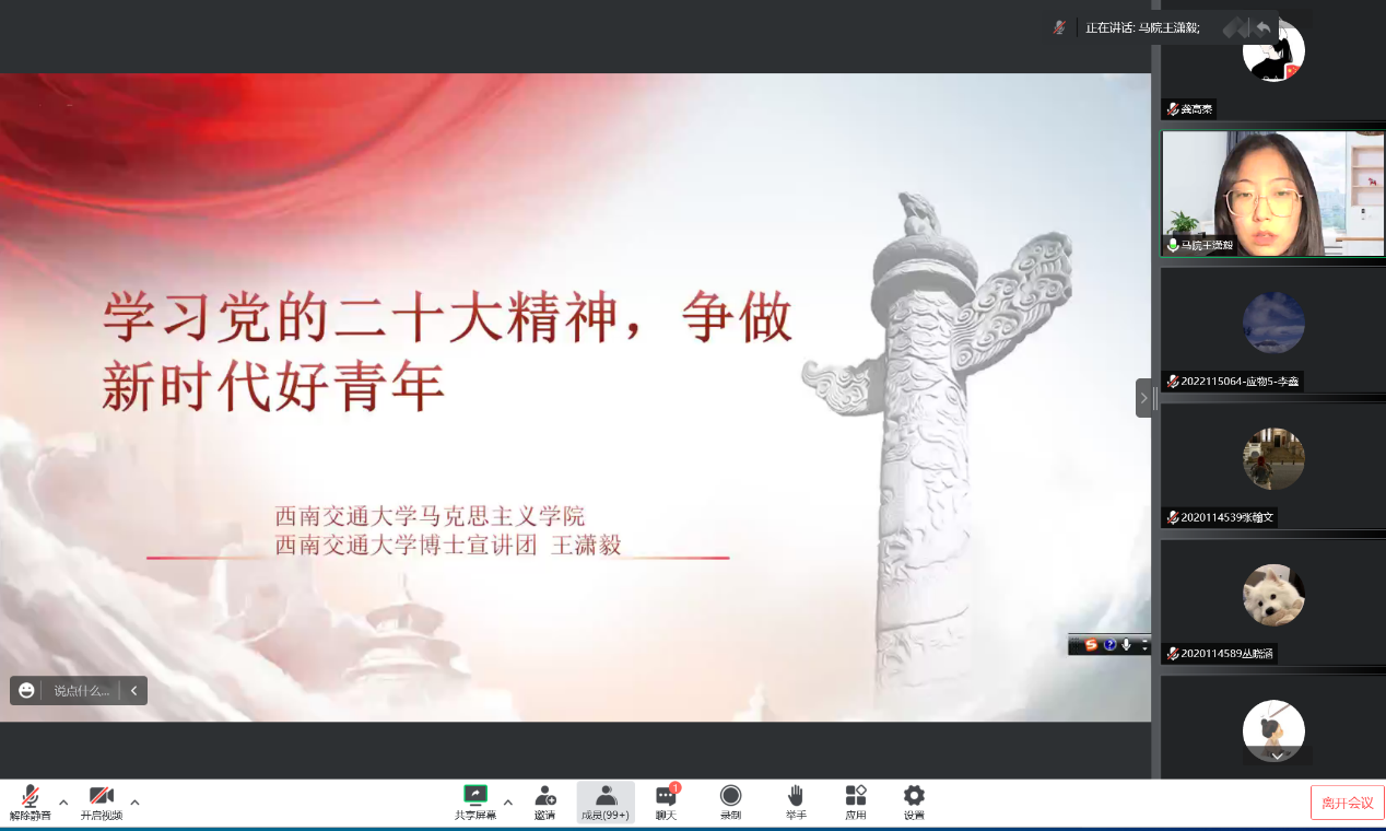 2022年11月30日19点,太阳成集团tyc122cc通过腾讯会议开展青马工程培训之“学习贯彻党的二十大精神,争做时代好青年”理论学习活动。本次学习活动由辅导员老师龚高秦主持,西南交通大学马克思主义学院博士宣讲团成员王潇毅博士主讲,物理科学与技术学院大一、大二、大三年级全体班长团支书、和学院全体发展对象和入党积极分子参与。