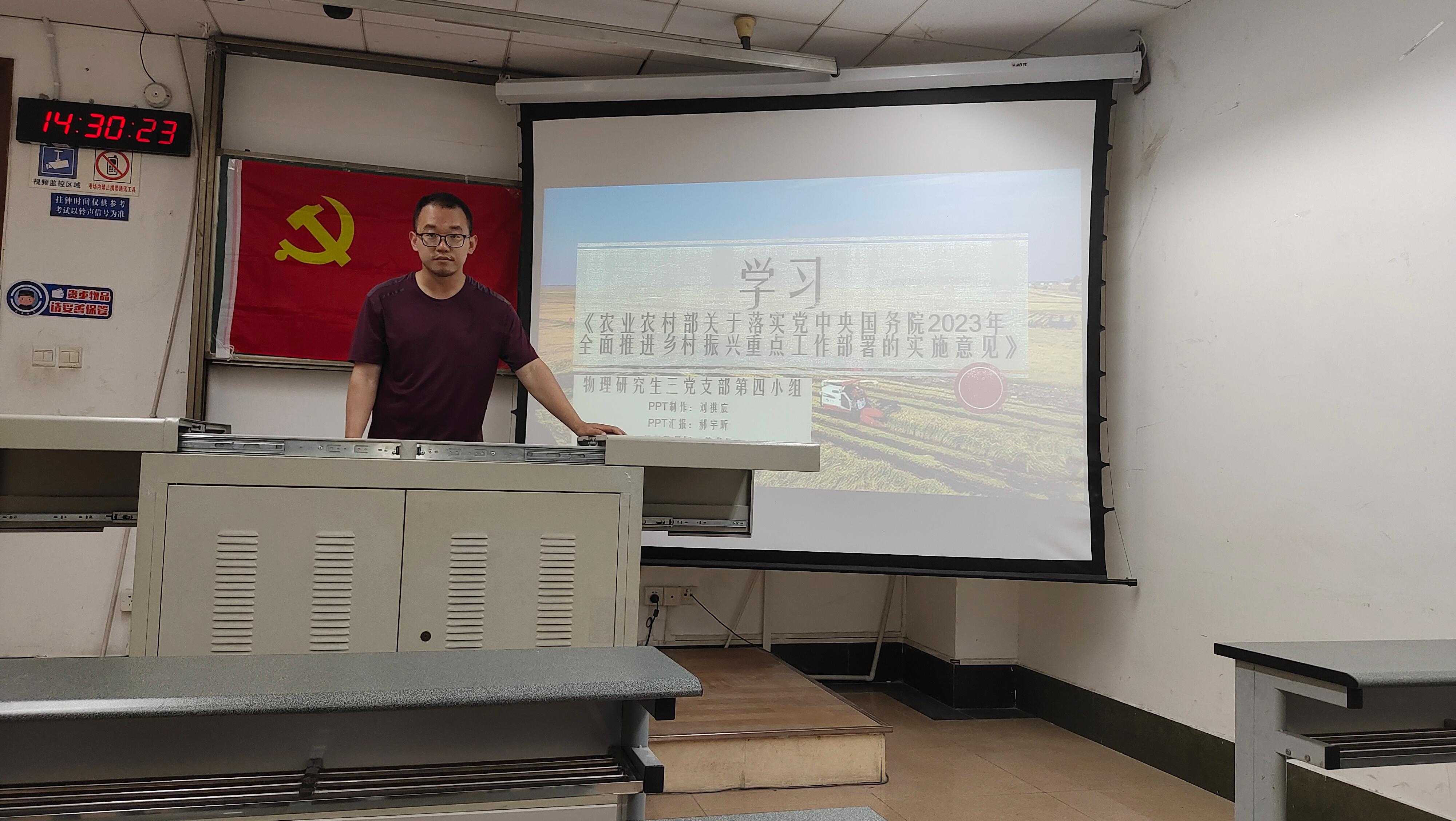 2023年5月5日14:30,物理研究生三党支部在九里校区J4304B开展了以“学习《农业农村部关于落实党中央国务院2023年全面推进乡村振兴重点工作部署的实施意见》文件”为主题的主题党日活动。三支部全体党员同志参加了此次学习活动,活动由太阳成集团tyc122cc研究生三党支部副书记孙海龙同志主持。