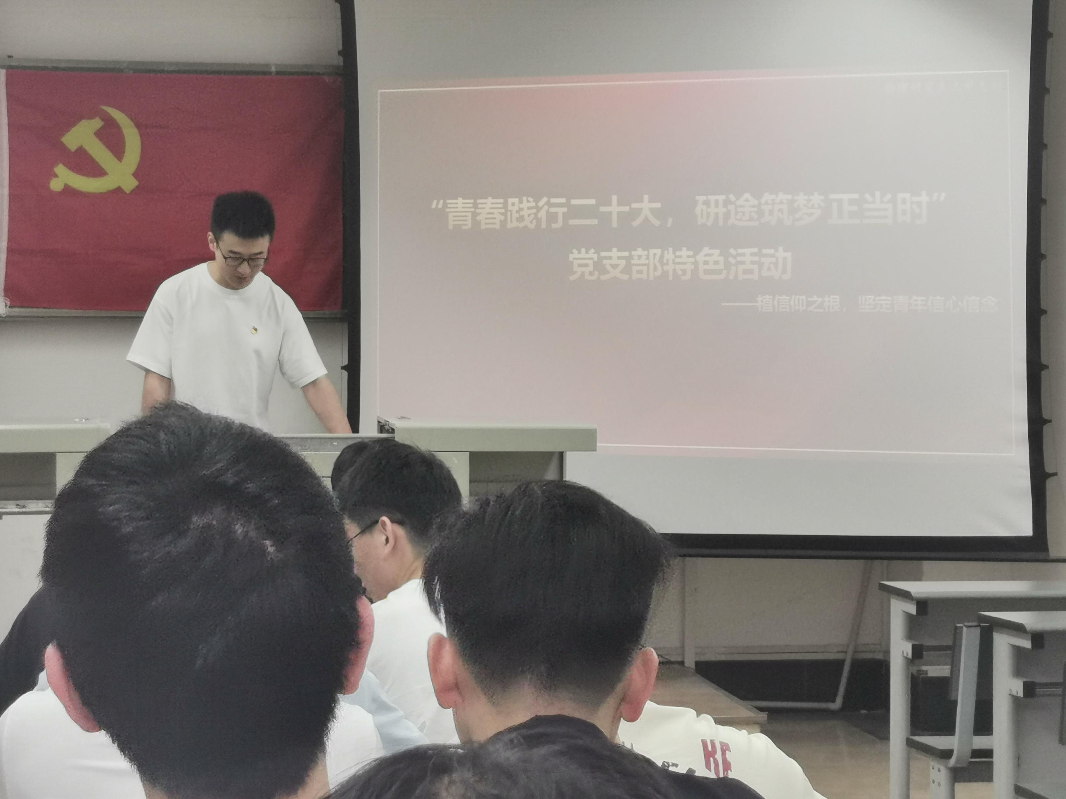 为增强支部党员同志的信心信念,拓宽支部党员同志的视野,2023年5月5日15:05,太阳成集团tyc122cc研究生三党支部在九里校区J4304B举办了“植信仰之根,坚定青年信心信念”主题党日活动。活动分为表彰优秀党员同志、共同观看纪录片和介绍家乡三个环节。