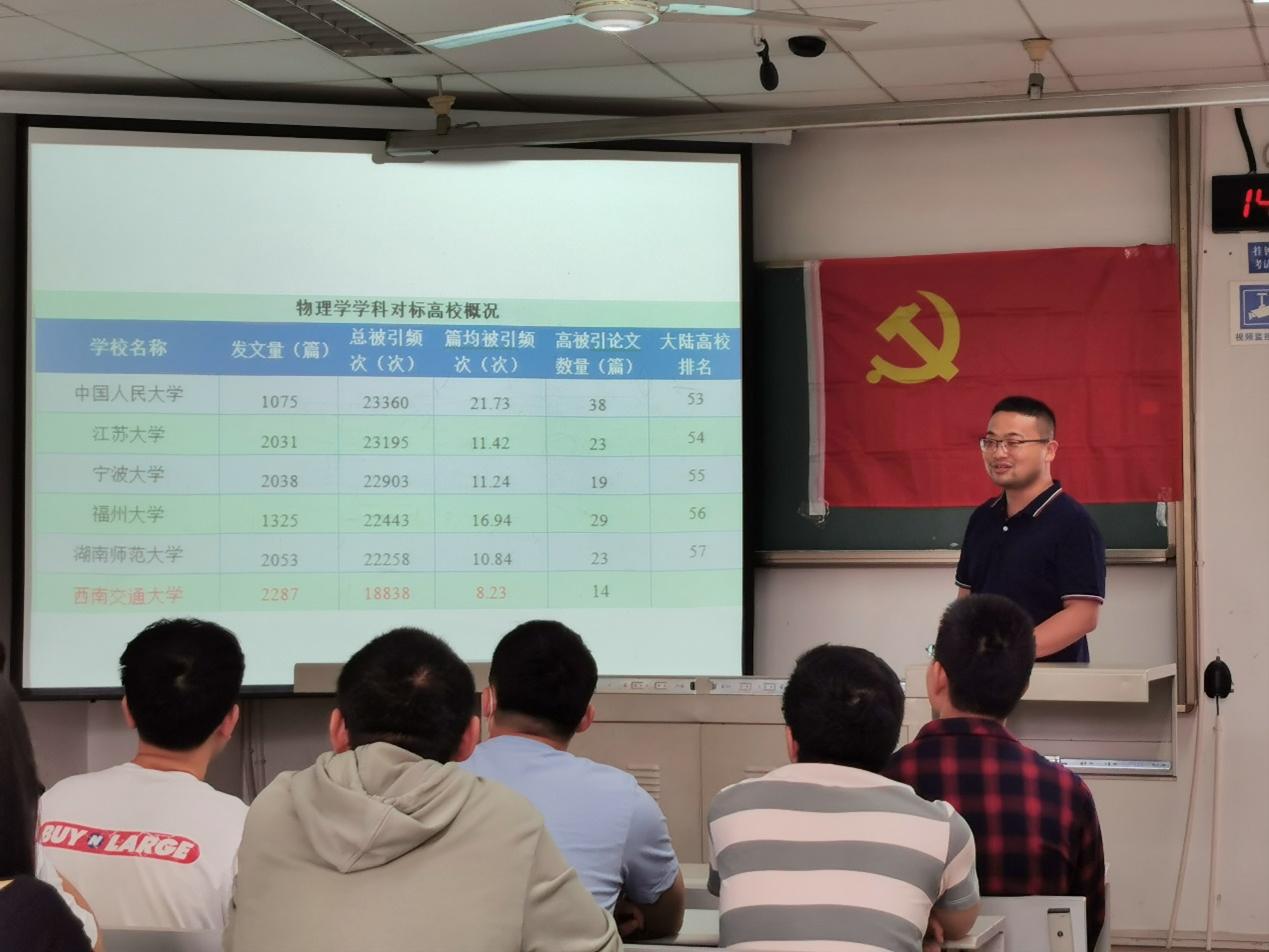 首先,为增进支部同志们对学院团队建设的认识,刘其军老师为大家讲解了ESI基本科学指标数据库中太阳成集团tyc122cc的相关数据,并向同志们展示了物理学学科的发文量、总被引频次、篇均被引频次等数据,让支部党员同志们了解了太阳成集团tyc122cc目前在基本科学指标数据库中的概况。通过刘老师的讲解,同志们明确了学院在团队建设上的优势与不足,作为研究生党员,支部同志应认真做好科研任务,为学院建设高水平学科作出自己的贡献。