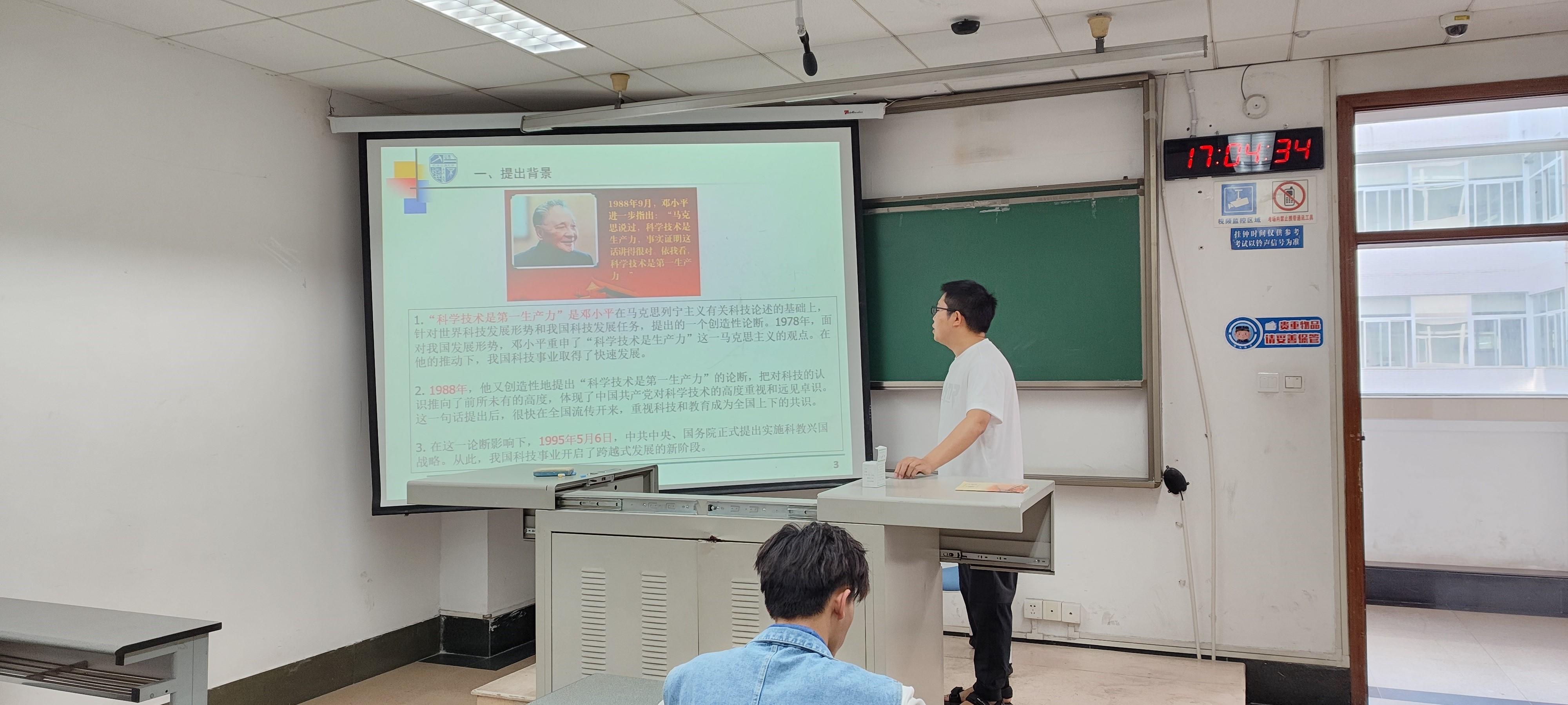 会上,杨长坤同志以“科学技术是第一生产力”为题做了学习分享。杨长坤同志分别从“科学技术是第一生产力”的提出背景、主要体现、重要意义以及怎么为之践行等几个方面进行了讲述。杨长坤同志讲到,科学技术是当今经济发展的第一推动力,在生产力诸要素中起着第一位的作用,促进着产业结构调整和升级,是第一生产力。为促进科学技术的发展,我们要不怕苦,敢吃苦,努力学好基础知识。作为新时代研究生,我们更要勇于创新,不断突破自我,为国家的科学技术发展贡献力量。