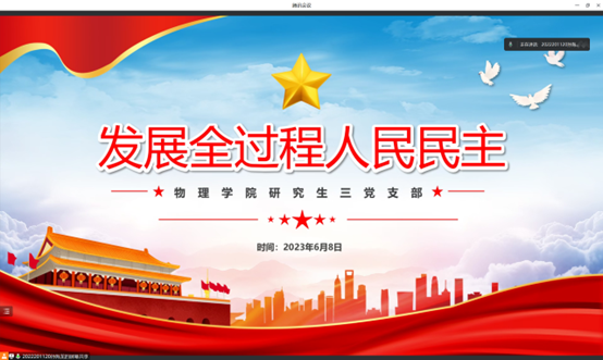 最后,孙海龙带领支部党员同志进行了“发展全过程人民民主”理论专题学习。学习内容包括“坚定中国特色社会主义政治制度自信”、“深刻把握全过程人民民主的丰富内涵”、“在实践中坚持和发展全过程人民民主”三个板块。此次学习让支部党员同志们深刻领悟到了“真民主、好民主,就要真正做到人民当家作主”的重要思想。