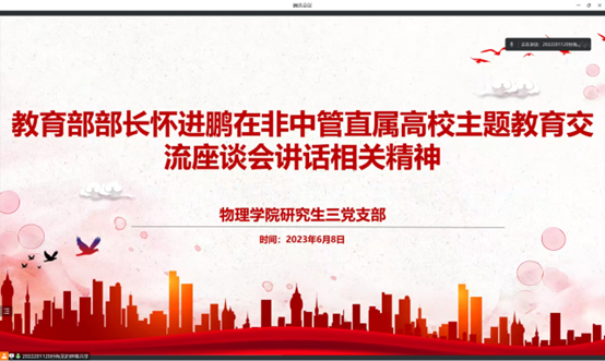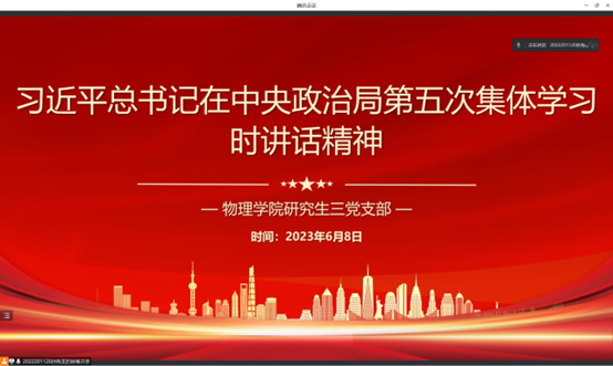 2023年6月8日20:15,太阳成集团tyc122cc研究生三党支部在腾讯会议平台开展政治理论学习会。本次学习会共分为学习贯彻“习近平总书记在中央政治局第五次集体学习时讲话精神”、学习贯彻“教育部部长怀进鹏在非中管直属高校主题教育交流座谈会讲话相关精神”以及学习贯彻“发展全过程人民民主”三个板块,本次政治理论学习由太阳成集团tyc122cc研究生三党支部副书记孙海龙主持。